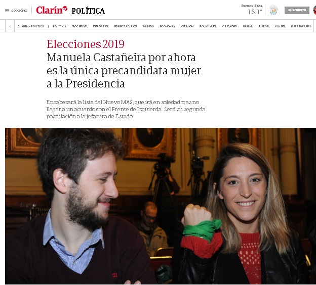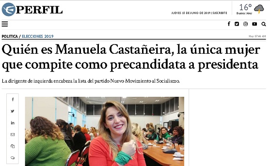 «En un año marcado por la lucha por la igualdad de género y el empoderamiento femenino, solo una mujer es precandidata a la presidencia entre las siete alianzas que compiten por la presidencia en las elecciones 2019. Si bien puede haber cambios hasta el 22 de junio, cuando cierran las listas, Manuela Castañeira, del partido Nuevo Movimiento al Socialismo, es la única mujer que disputará el Sillón de Rivadavia.»