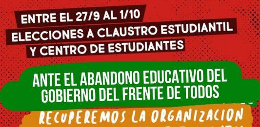 🔊 Escuchar el Artículo Entre el 27/9 y el 1/10 se realizarán las elecciones a Consejo Superior, Departamentos y Centro de Estudiantes en la UNQui. Las mismas se desarrollan en un contexto atípico. A pesar de que la sociedad ha regresado en su mayoría a la “normalidad” esto no ha sucedido en la UNQui. Por … Sigue leyendo Ante el abandono educativo, recuperemos la organización del movimiento estudiantil