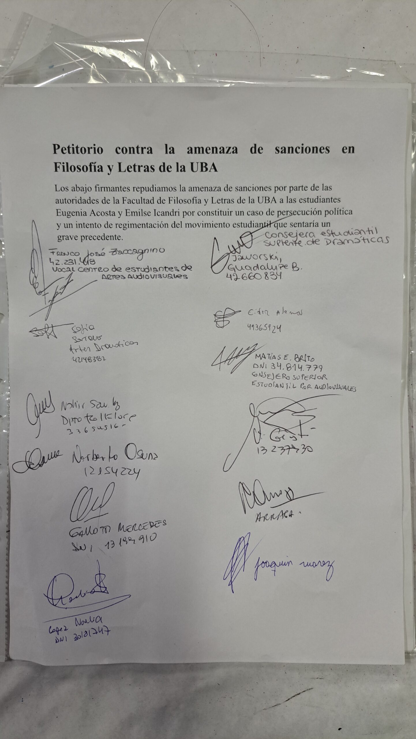 Para terminar, quiero decir dos cosas más. Este ataque es persecutorio y discriminatorio a dos estudiantes que son mujeres laburantes. Ellas trabajan en el Consejo de la Niñez y la Adolescencia en la Ciudad de Buenos Aires asistiendo a niñes, niñas y niños en situación de vulnerabilidad. Este tipo de ataques le da espacio a sectores de derecha y de ultra-derecha que intervienen de manera reaccionaria en la coyuntura, que niegan la lucha por los derechos humanos, que niegan la cifra de les 30.000 y es por eso que quiero pedir a este Consejo que pueda dar su solidaridad a estas estudiantes. Hemos traído un petitorio contra las amenazas de sanciones a las compañeras, es un petitorio que está circulando a nivel nacional e internacional y que han firmado ya Nora Cortiñas, el premio nobel de la paz Adolfo Pérez Esquivel, Thelma Fardín, organizaciones de derechos humanos como el Encuentro de Memoria, Verdad y Justicia y numerosas organizaciones de derechos humanos, gremiales y políticas, gremiales como la Secretaría de Derechos Humanos de la CTA-A Capital.