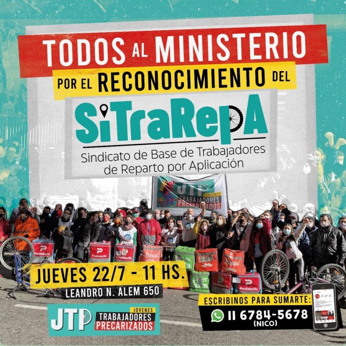 La presentación del SiTraRepA en el Ministerio de Trabajo hace un mes y medio fue un verdadero festejo, y este jueves 22 de julio a las 11hs los repartidores y repartidoras vamos a volver a darnos cita allí, en Alem 650, para presentar cientos de nuevas afiliaciones y exigirle una vez más a ese Ministerio que reconozca el SiTraRepA como herramienta de lucha de las y los repartidores en su pelea por el reconocimiento de la relación laboral encubierta y plenos derechos laborales.