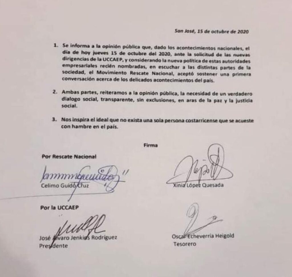 El acta que publicaron consta de tres acuerdos, siendo el segundo el único que refleja algo concreto y parece confirmar nuestro análisis: “Ambas partes, reiteramos a la opinión pública, la necesidad de un verdadero diálogo social, transparente, sin exclusiones, en aras de la paz y la justicia social”. El primero explica el acercamiento entre las partes, mientras que el tercero es una proclama humanista que firma cualquier sector dada su ambigüedad: “Nos inspira el ideal de que no exista una sola persona costarricenses que se acueste con hambre en el país”.