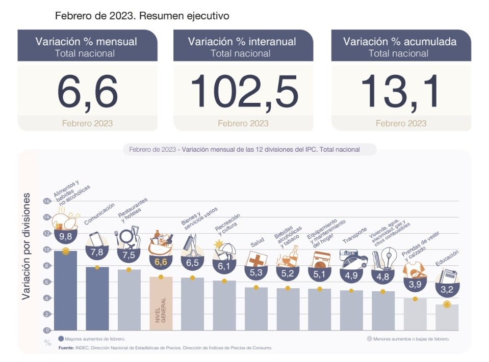 Los precios al consumidor (#IPC) subieron 6,6% en febrero de 2023 respecto de enero y 102,5% interanual. Acumularon un alza de 13,1% en el primer bimestre https://t.co/nYndki01f9 pic.twitter.com/B98rPAl6dA— INDEC Argentina (@INDECArgentina) March 14, 2023