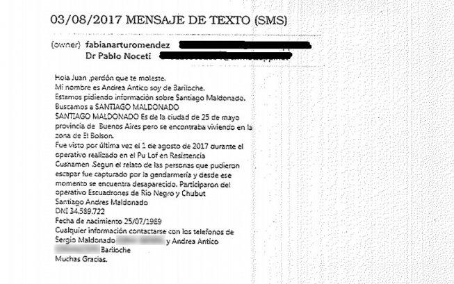 “Hola Juan, perdón que te moleste, mi nombre es Andrea Antico, soy de Bariloche estamos pidiendo información sobre Santiago Maldonado”. Este es un mensaje de texto enviado por la cuñada de Santiago mientras comenzaba su búsqueda luego de tres días de no recibir noticias suyas tras la represión. Este mensaje, enviado a un conocido, fue encontrado en el teléfono celular de dos funcionarios involucrados en la desaparición forzada y asesinato. Se trata del comandante de Gendarmería Fabián Méndez, quien lo reenvió al entonces Jefe de Gabinete del Ministerio de Seguridad, Pablo Noceti.