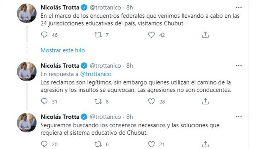 Respecto al escrache, Trotta los acusó de violentos en su cuenta de Twitter, como si el trato que vienen teniendo los trabajadores estatales de Arcioni, que los mantiene sin cobrar sueldo por meses, no fuera violento.