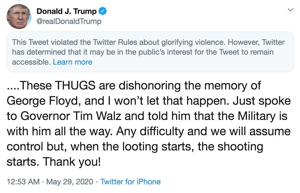 El presidente, Donald Trump, lejos de repudiar el asesinato racista, echó más leña al fuego amenazando en su cuenta de twitter con asesinar a los manifestantes que realicen saqueos: «Cuando comienzan los saqueos, comienza el tiroteo».