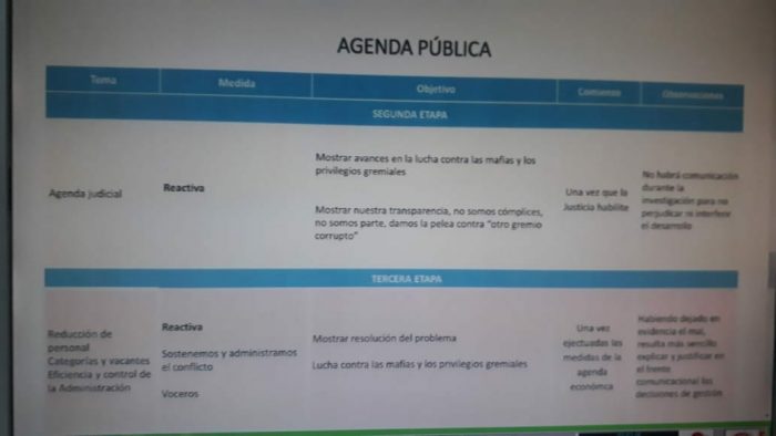 Al mismo tiempo la sección de agenda pública desnuda el rol de los medios de comunicación. En la parte proactiva-off, es decir por debajo de la mesa, dice: ¡»envío a la prensa informe general con pruebas para que se evidencie el mal y podamos actuar”! Este es el libreto detrás de la campaña de provocaciones de Lanata y los demás medios de “desinformación”. Acaban de ser mostrados por el gobierno como lo que verdaderamente son alcahuetes y lacayos a sueldo de los planes de ajuste neoliberal de los CEOs que gobiernan el país.