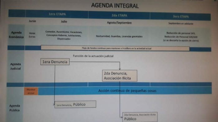 Esta parte se muestra muy bien como el gobierno usa la justicia como herramienta contra los trabajadores adelantando sin investigación las líneas por donde pretende realizar las denuncias contra el astillero. Aparecen cosas como: “posibles denuncias por irregularidades denunciadas por el HTC”, “investigación por fraude de la investigación pública”. Continúa con medidas aberrantes y repletas de falsedad y cinismo como: recomendar una serie de “denuncias penales de hechos ilícitos”. Entre ellos parecen “amenazas” de trabajadores a directivos, así como “discursos que atenten contra el orden democrático”. Como “evidencia” se cita un discurso donde se “pidió echar al presidente y la gobernadora”. El plan termina con la realización de denuncias en los tribunales de Lomas de Zamora por “presunto camino de lavado de dinero y asociación ilícita”