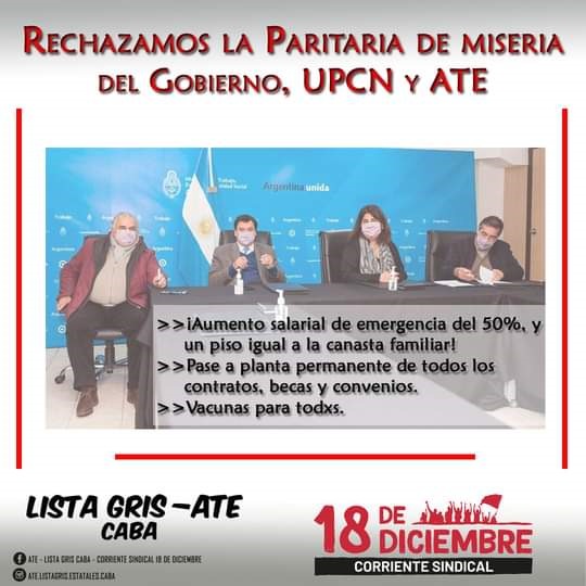 El miércoles 2 se va a realizar una caravana en la CABA y acciones en distintos puntos del país, desde la Lista Gris ATE Estatales en la Corriente Sindical 18 de Diciembre vamos a participar de estas acciones, convocando a nuestras y nuestros compañeros de trabajo para que se vea en todos lados que los estatales no nos tragamos el fiasco de esta paritaria de miseria, y que vamos a pelear por un salario que alcance para vivir.