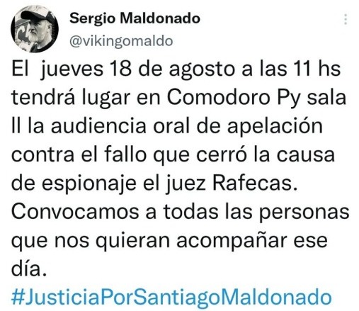 Tras cumplirse 5 años de la desaparición seguida de muerte de Santiago Maldonado a manos de la Gendarmería, su hermano Sergio se presentó esta semana ante el tribunal de Comodoro Py para exigir que se revierta el cierre de la investigación y los sobreseimientos que dispuso el juez Daniel Rafecas en torno al espionaje y persecución de la Gendarmería sobre la familia de Santiago y organizaciones de Derechos Humanos.