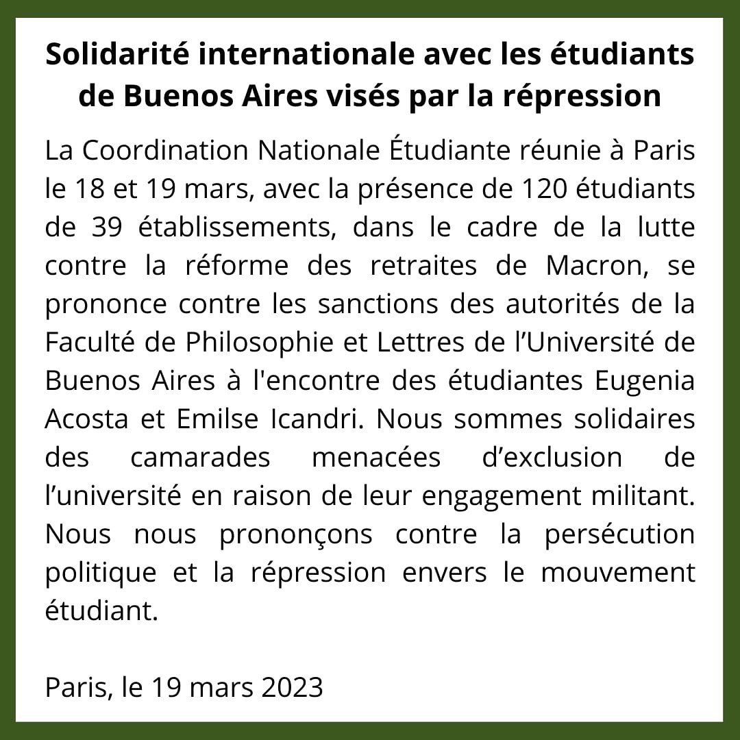 «La reunión de la Coordinadora Nacional de Estudiantes realizada en París los días 18 y 19 de marzo, con la presencia de 120 estudiantes de 39 establecimientos, como parte de la lucha contra la reforma previsional de Macron, se pronuncia en contra de las sanciones de las autoridades de la Facultad de Filosofía y Letras de la Universidad de Buenos Aires contra las estudiantes Eugenia Acosta y Emilse Icandri», señala el comunicado de los estudiantes franceses.