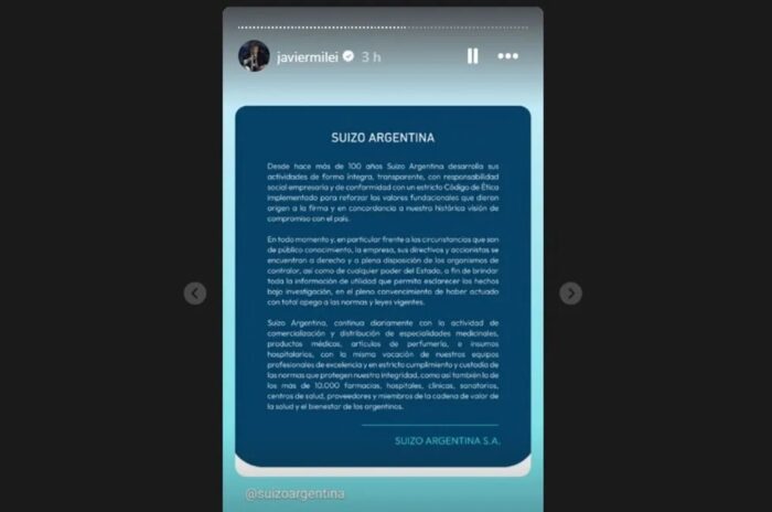 Mientras tanto, la empresa Suizo Argentina, que junto al gobierno tiene sus huellas por todo el escándalo, hace comunicados diciendo estar a disposición de la Justicia a pesar de que sus dueños huyeron como ratas de sus casas durante los allanamientos: “Desde hace más de 100 años, Suizo Argentina desarrolla sus actividades de forma íntegra, transparente, con responsabilidad social empresaria y en conformidad con un estricto Código de Ética…”