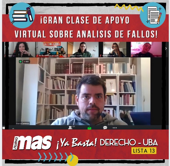 El miércoles desde el ¡Ya Basta! – La Salida es por la Izquierda – Lista 13 organizamos una clase de apoyo virtual sobre cómo analizar fallos, con la participación de más de 150 estudiantes de la facultad y del CBC. Esta iniciativa tuvo muchísimo impacto entre les estudiantes, porque la gestión de la UBA y de la facultad deja a les pibes en banda, especialmente de los primeros años y el CBC.