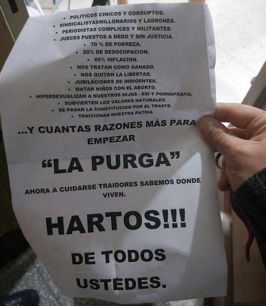 Al estilo de la última dictadura genocida, el volante llama a comenzar «la purga» y amenaza con que «ahora a cuidarse traidores, porque sabemos donde viven». Los dirigentes del FDT publicaron un comunicado en donde caracterizan al hecho de «un acto de violencia política inédito».