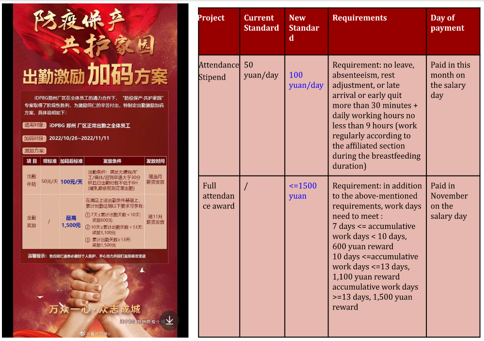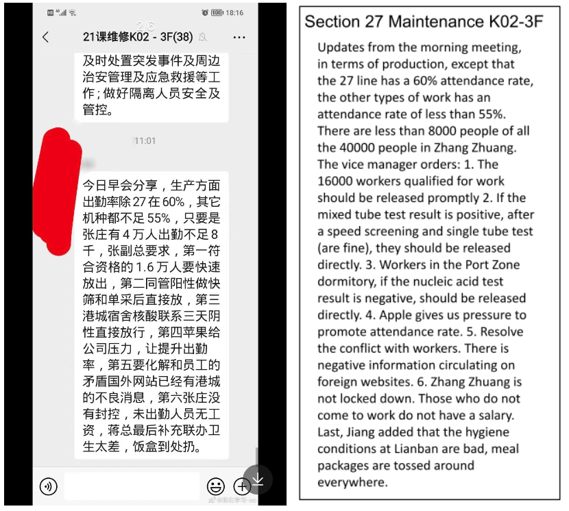 Mientras tanto, los trabajadores que permanecen en la fábrica son obligados a trabajar en el medio del brote de Covid-19. Foxconn intentó promover la “asistencia regular”, con bonos y recompensas. Pero, comparado con poner su vida en riesgo, el salario no es tan atractivo como solía ser. Un mensaje interno muestra que muchos sectores tienen una asistencia menor al 55%. Un empleado reveló a China Labor Watch que, debido a la baja asistencia, los trabajadores de dos líneas distintas ahora trabajan en una sola, y otras fueron suspendidas. A raíz de esto, Foxconn alivió las restricciones del confinamiento y los requisitos de testeo para que más trabajadores se quedasen en la línea de producción.