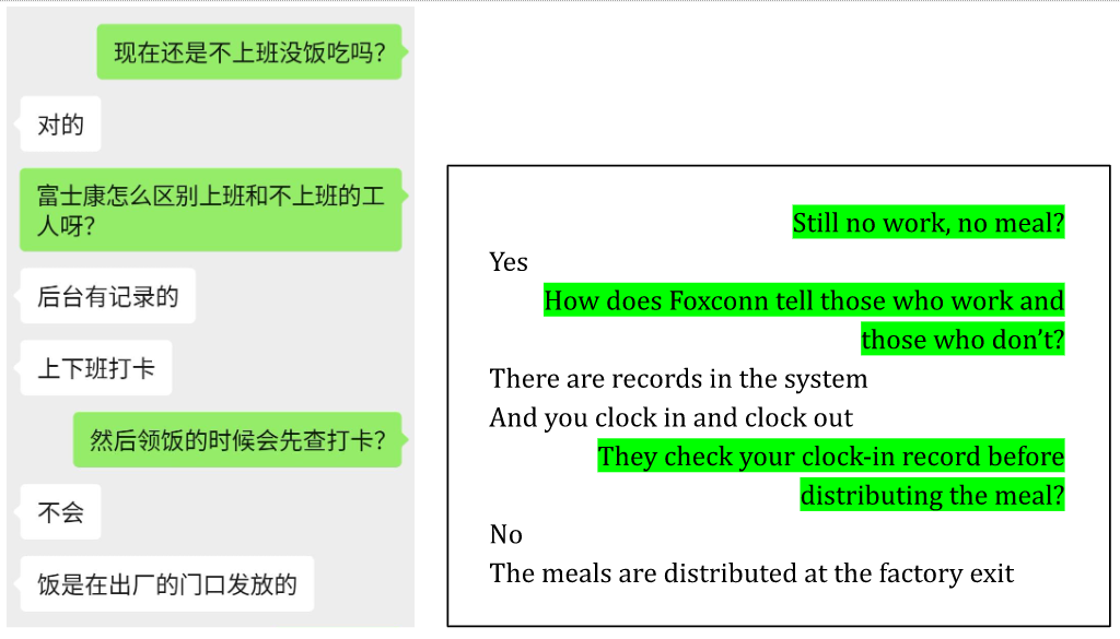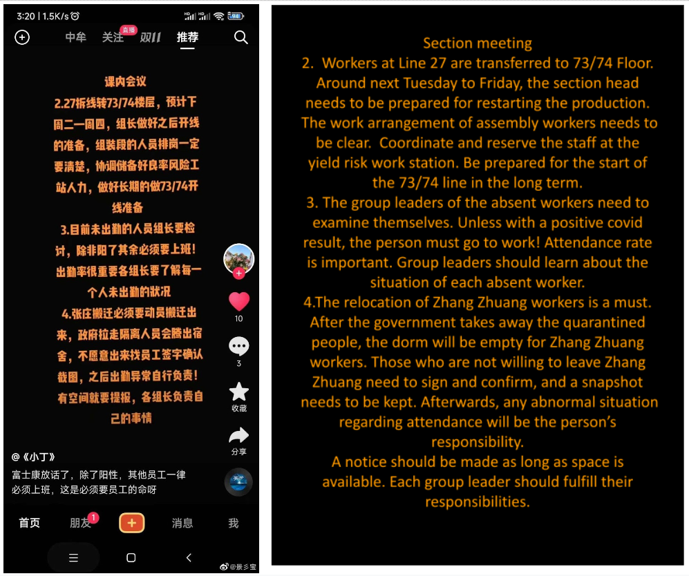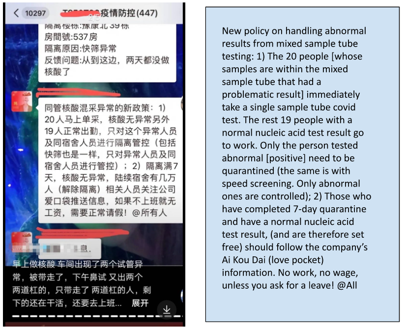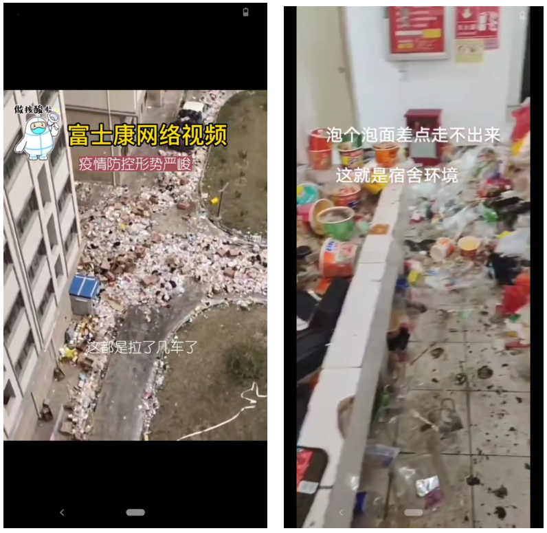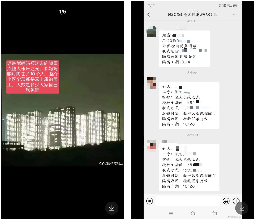 Luego del brote de Covid-19 en la fábrica Foxconn no solamente fue incapaz de proveer condiciones de vida dignas o tratamiento médico adecuado sino que sometía a trabajadores no contagiados a una alta exposición al virus. En primer lugar, los trabajadores que fueron llevados de su dormitorio a la cuarentena fueron olvidados, por lo que recurrieron a las redes sociales para pedir ayuda. La hija de una de las trabajadoras de Foxconn posteó en Weibo el 22 de octubre, pidiendo ayuda para su madre. Luego de ser confinada, ella y otras compañeras fueron ubicadas con trabajadoras contagiadas y otros con un “código verde”. Luego de que sus compañeras mostrasen síntomas como fiebre, escalofríos y dificultades para respirar, no recibieron ningún tipo de medicamentos ni tratamiento médico. Solo podían controlar su fiebre tomando agua caliente y aplicando un pañuelo en su cabeza. Ni siquiera se realizaron test de ácido nucleico durante 3 o 4 días seguidos. Otra trabajadora, mostrando su permiso frente a la cámara, dice que fue confinada en la Foxconn de Yukangbei, en su dormitorio, con 39,9 grados de fiebre, recibiendo ningún cuidado durante este tiempo.