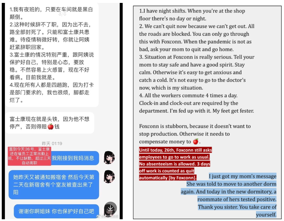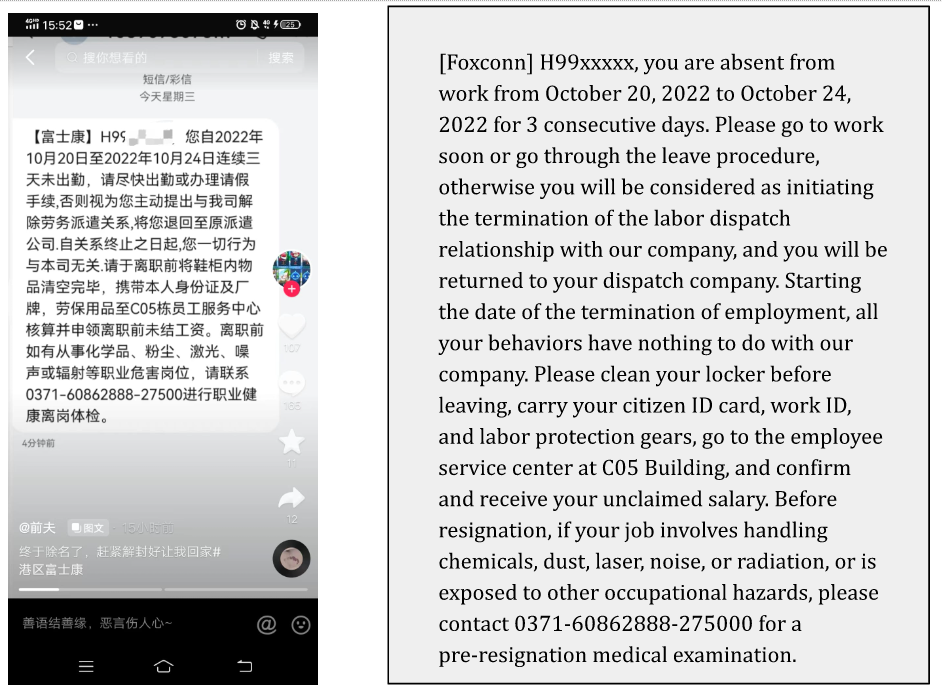 Muchos trabajadores tuvieron contacto con compañeros contagiados, están preocupados debido a la exposición al virus o son reticentes a volver a trabajar en medio del caos, pero se les pide volver a trabajar sobre la base de un mero test negativo de ácido nucleico. Múltiples fuentes prueban que, si un trabajador se ausenta por tres días, Foxconn automáticamente extingue la relación laboral.