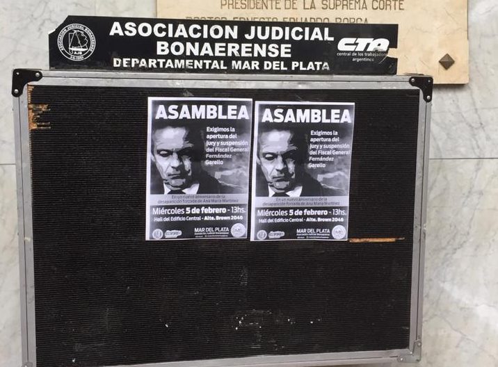 Mar del Plata. El miércoles 5 de febrero se realizó en el hall de los tribunales una asamblea de la Asociación Judicial Bonaerense en homenaje a la militante del PST Ana María Martínez, asesinada por la dictadura militar 38 años atrás, y en pedido de destitución y juicio a Fabián Fernández Garello, servicio de inteligencia policial durante la dictadura que actualmente se desempeña como Fiscal General de Mar del Plata.