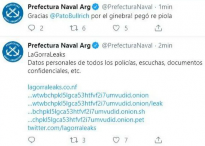 Además de esto, Prefectura Naval denunció sufrir un hackeo de su cuenta de Twitter a las 11 de la mañana de ayer, cuando se publicó, en un tweet, que tres embarcaciones de la fuerza sufrieron un ataque de misiles británicos, y que 27 oficiales murieron producto del mismo. Luego, en otra publicación, invitaba a ingresar a LaGorraLeaks para conocer la filtración de los documentos policiales. Para finalizar, también se burlaron de la ministra Bullrich agradeciéndole por una botella de ginebra.