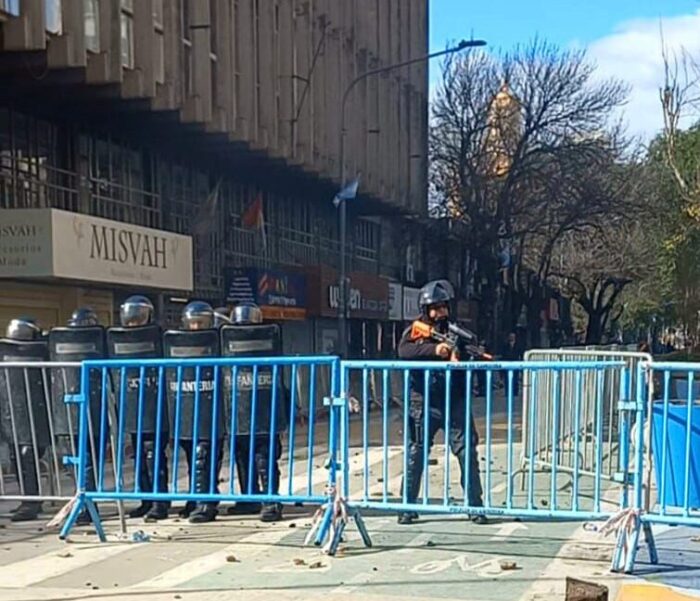 A los pocos minutos de arribar al lugar la policía de la provincia empezó a utilizar gas pimienta, gases lacrimógenos y balas de goma para intentar dispersar la movilización. En el medio de ese despliegue represivo es que se llevaron detenidas a dos compañeras docentes. La represión, que en un primer momento hizo replegar a la movilización, no logró su cometido: nuevamente se volvió al lugar, esta vez sumándose más gente independiente. Fue una respuesta democrática frente al ataque del gobierno y la policía.