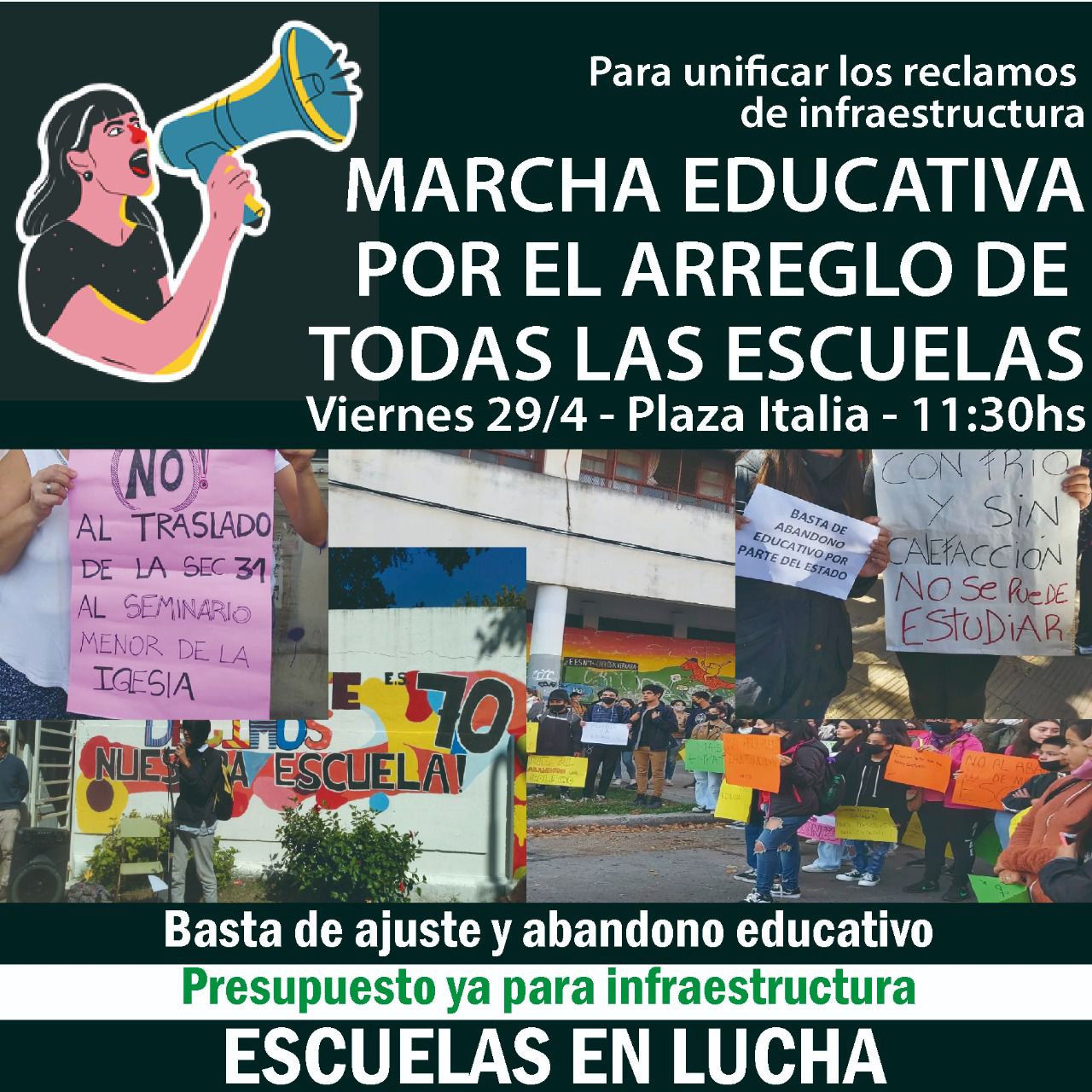 El docente y referente de la Lista Gris Carlos Fuentealba, de la oposición de Suteba, Eric «Tano» Simonetti, informó que «a raíz de la cantidad de escuelas que hoy en la ciudad de La Plata tenemos graves problemas edilicios, de infraestructura, como el Vergara, que viene de realizar una masiva movilización reclamando por el arreglo de los techos, el Belgrano que tiene un proceso de deterioro enorme, con baños rotos y hace años está imposibilitado de usar su gimnasio y tiene techos que se caen, la Secundaria 29, problemas de techos en el Normal 2, el Comercial, que se empezó la obra pero hace falta continuarla, la Secundaria 62, son decenas y decenas de escuelas de La Plata y por eso decidimos unificar el reclamo y realizar una movilización este viernes a las 11:30 desde Plaza Italia, de docentes y estudiantes para que el gobierno nos escuche».