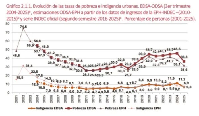 La cifra oficial del INDEC es que el 31,6% de la población es pobre en el segundo trimestre del 2025, mientras que el dato de la UCA dice que lo sería el 36,3% en el tercer trimestre.