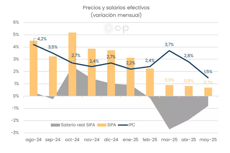 Caída real de los salarios según informes del INDEC y SIPA, cifras oficiales del gobierno.