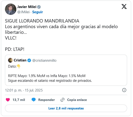 “Sigue llorando mandrilandia. Los argentinos viven cada día mejor gracias al modelo libertario” dijo el mentiroso en jefe de la runfla «libertaria», el propio Milei, con ese índice.