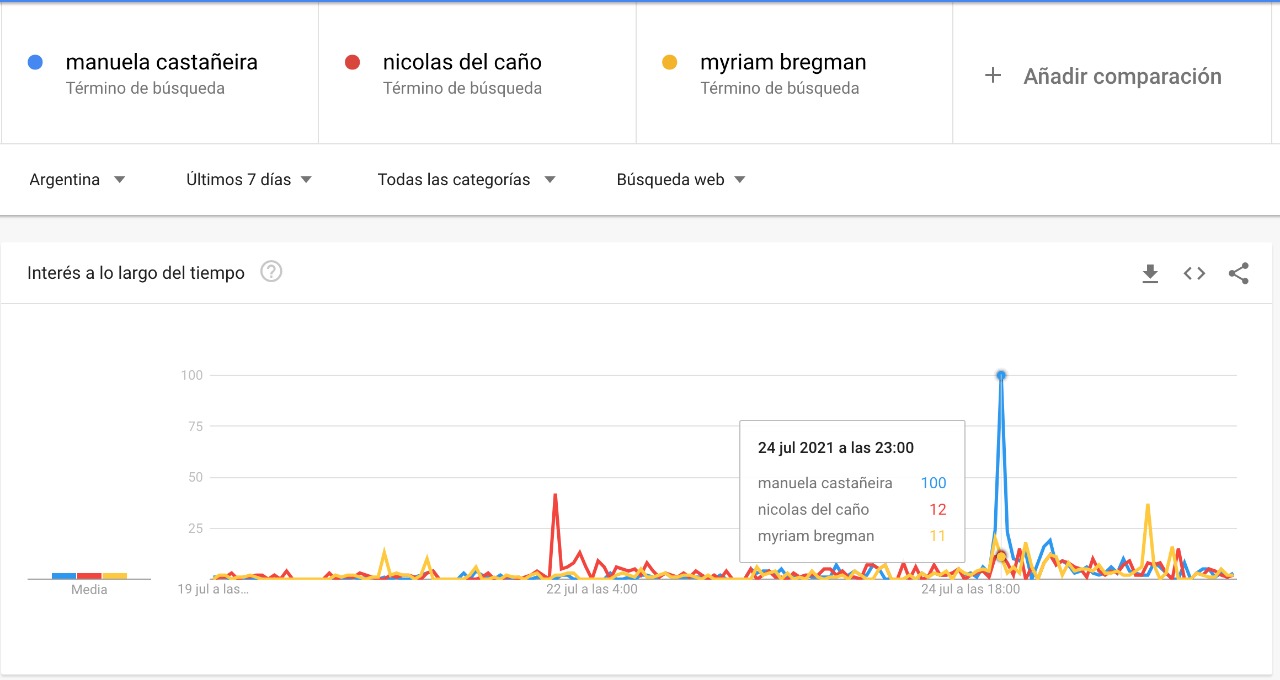 Cuando observamos las tendencias en Google Trends, vemos que, el día del programa, las búsquedas de Manuela Castañeira superaron muchísimo a Nicolás Del Caño, que no logró mover el amperímetro, y que el electorado comienza a verlo como falto de personalidad y propuestas. ¿No será hora de renovar a la izquierda con caras nuevas, que expresen las luchas por abajo? Manuela Castañeira es una alternativa para avanzar en esa perspectiva.