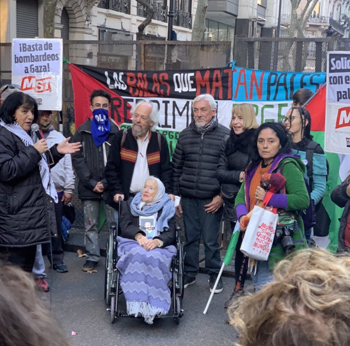 El acto comenzó con las palabras de Tilda Rabi, presidenta de la Federación de Entidades Argentino-Palestinas. Entre los oradores se encontraron referentes de organismos de DDHH, entre ellos Nora Cortiñas de Madres – Línea Fundadora, de la Liga Argentina por los Derechos del Hombre, la APDH y el SERPAJ. También se hicieron presentes organizaciones sociales y partidos de izquierda solidarios con la causa palestina.
