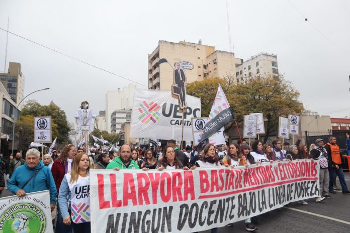 El principal reclamo es por un aumento salarial acorde a la canasta familiar. En ese marco, la marcha reflejó el clima de ebullición y descontento que se vive en las escuelas contra las políticas de ajuste de los gobiernos de Llayora y Milei, con escuelas destruidas, recarga laboral, cierres de cursos y jubilaciones miserables.