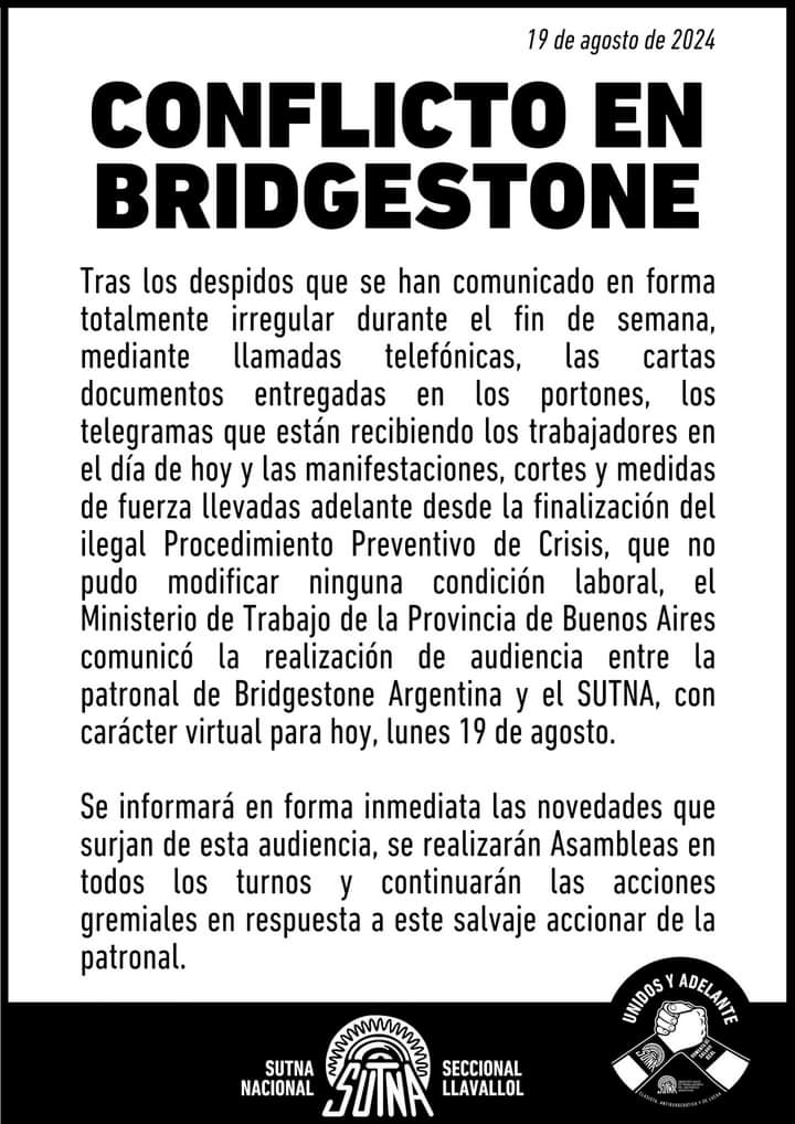 Por su parte, la conducción del SUTNA (Sindicato único de los trabajadores del neumático de Argentina) emitieron también una denuncia después de la jornada de paro de la noche del domingo y el lunes.