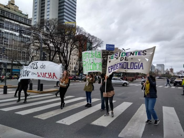 Sofía: Nos venimos organizando hace aproximadamente un año y un par de meses, cuando el año pasado los que en ese momento estaban en primer año ya pasaban tres meses sin cobrar, y se sumaba una situación de inflación y económicamente mala. Pero particularmente año pasado se sumó que el Ministerio de Salud de la Nación dejaba de ser ministerio y pasaba a rango de Secretaría. En ese contexto se estaban confeccionando los contratos de primer año pero había una incertidumbre total, no se sabía si iban a cobrar, si Rubinstein iba a seguir estando a cabeza de Salud, no se sabía qué firma se necesitaba para esos contratos.