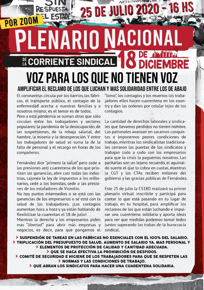 Este 25 de julio la CS18D realizará su primer plenario virtual.Inscribite y participápara contar lo que está pasando en tu lugar de trabajo, en tu hospital, para amplificar los reclamos de los que están luchandoe impulsar una cuarentena solidaria;y aportá ideas para ver qué medidas podemos tomar todos juntos superando las trabas de la burocracia sindical.