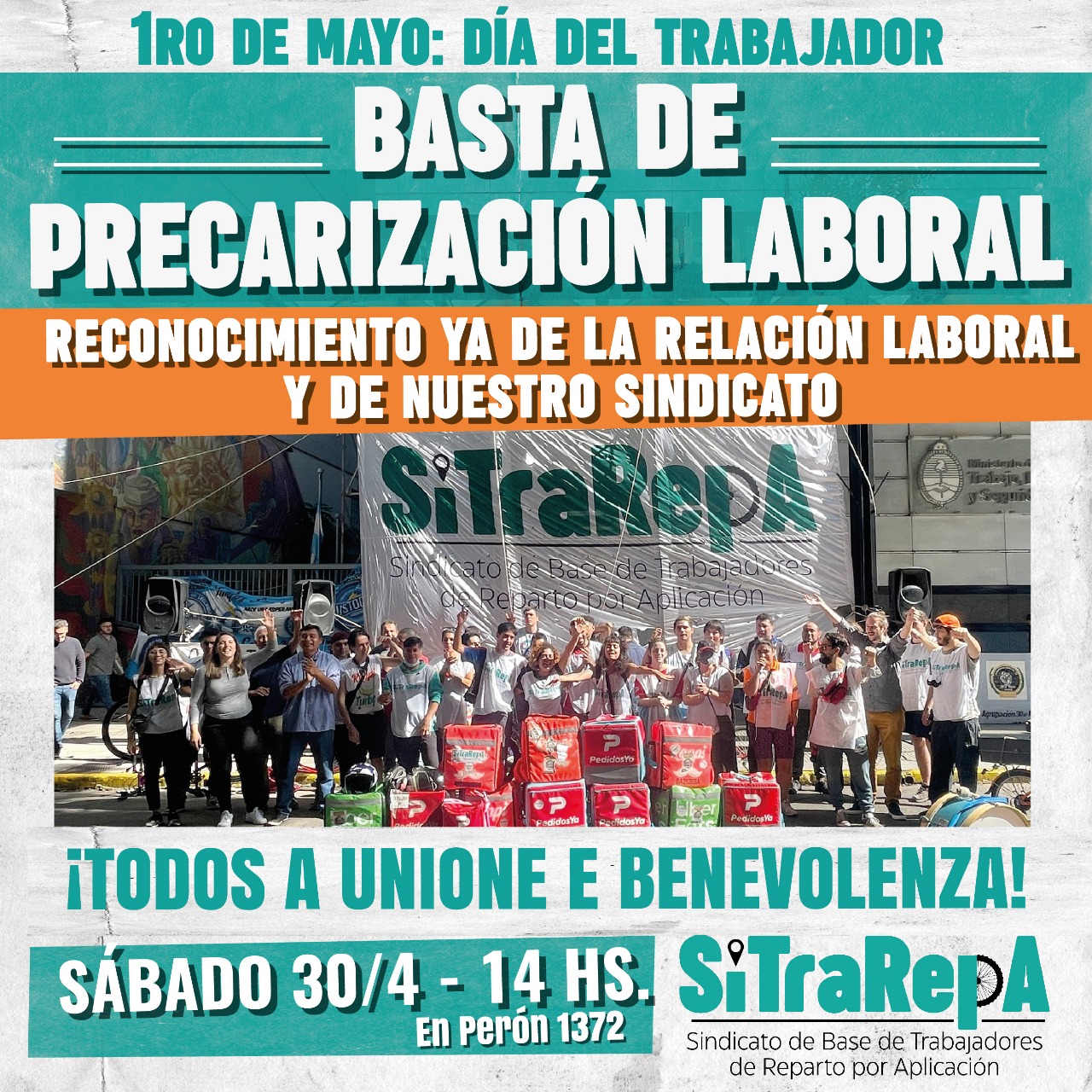 Invitamos a todos los repartidores y trabajadores por aplicación a ser parte de esta hermosa fecha de nuestra clase, de las mayorías trabajadoras, para redoblar la lucha por el reconocimiento del SiTraRepA y todos nuestros derechos!