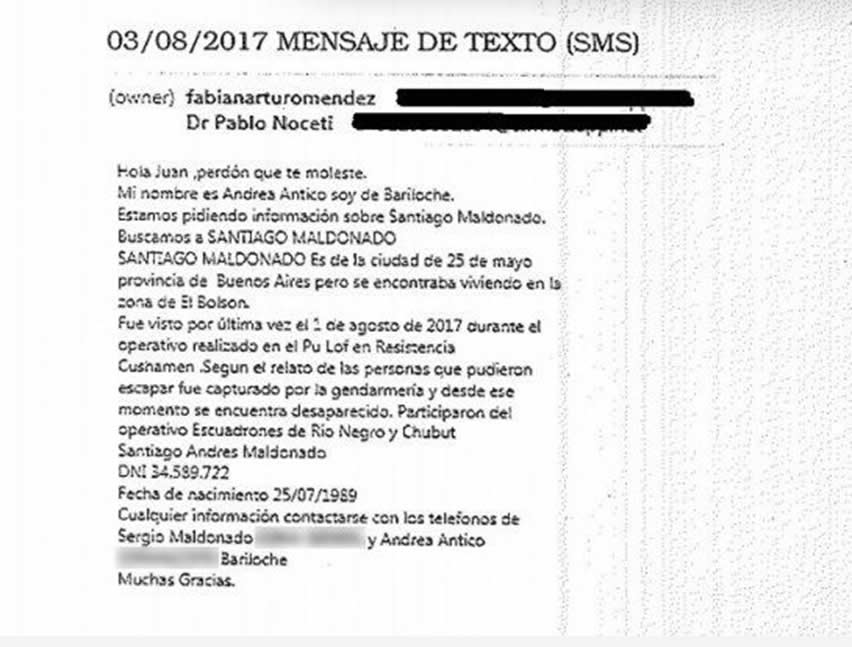 En este sentido, entre las pruebas que evidencian el accionar de los gendarmes, se cuenta con los mensajes de texto que Méndez enviaba a sus superiores reportando los intercambios telefónicos que tenía la familia Maldonado.