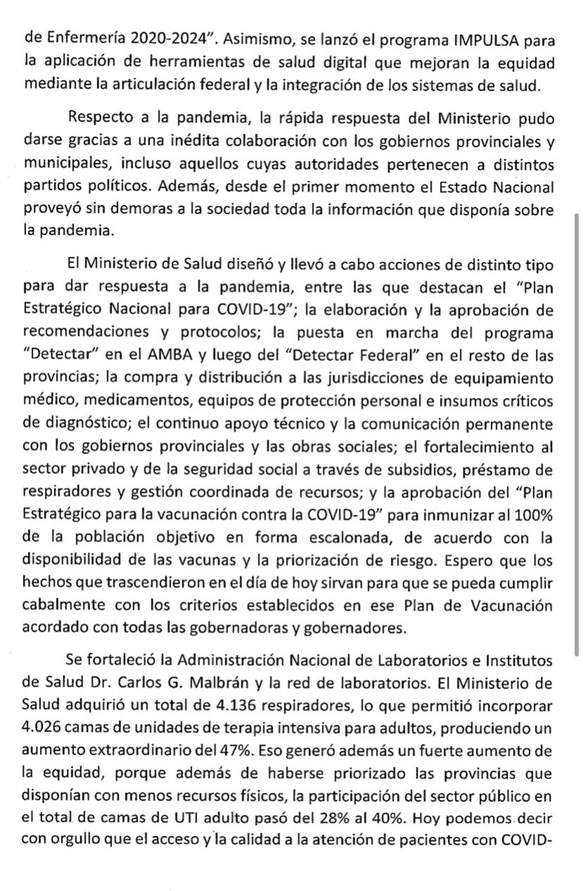 El resto de la carta es simplemente una impostura, una reivindicación de su gestión frente a la pandemia. Es ampliamente sabido que los trabajadores de la salud de todo el país tuvieron que enfrentar la pandemia en la más absoluta de las precariedades, poniendo en riesgo su salud y sus vidas, casi sin insumos ni apoyo del gobierno. El presupuesto de la salud pública apenas se movió de los números críticos de años anteriores. La administración más o menos «exitosa» de la crisis del Coronavirus fue más por la larga cuarentena (medida necesaria pero en sí misma insuficiente) que por la política de salud pública, que debía ser reforzada mientras se ganaba tiempo cuando la mayoría de la gente estaba en sus casas.