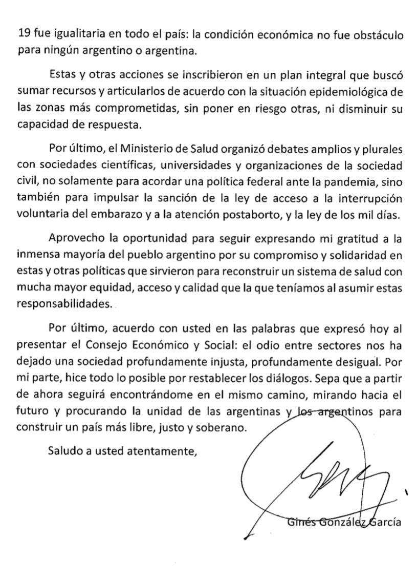 Con dudas, el comunicado de la renuncia comienza con una pobre excusa. Dice sobre «los trascendidos» (que difícil decir «los hechos públicos de que hice vacunar a mis amigos») que no estuvieron tan mal porque los vacunados VIP eran parte de la población de riesgo y que su secretaria se confundió involuntariamente en la citación para vacunarse en el ministerio mismo, que él no lo sabía porque estaba en Entre Ríos. Si la cosa no fue tan grave porque eran parte de la población de riesgo: ¿Por qué aclarar que él estaba en Entre Ríos y que el error fue de su secretaria privada?
