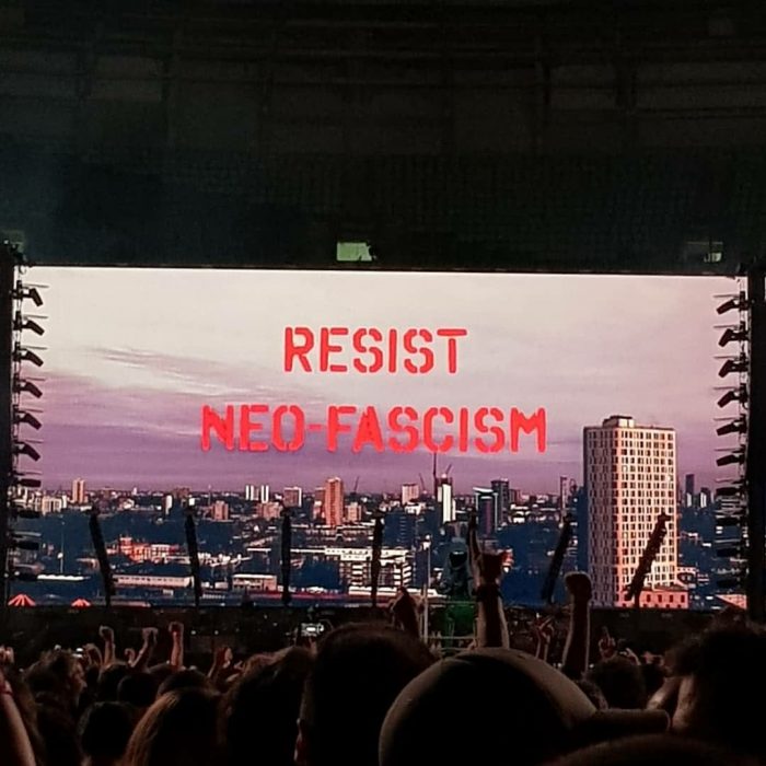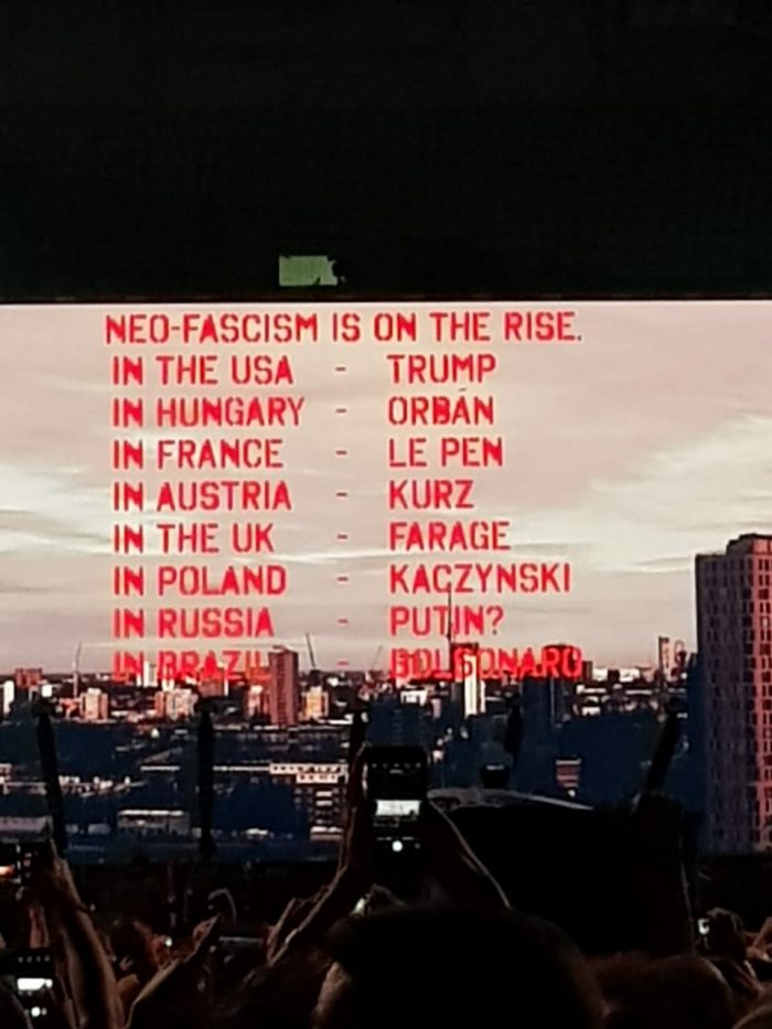 Roger Waters dio la nota nuevamente en la noche de ayer al innaugurar su gira por Brasil en el Arena Palmeiras de San Pablo. El ex Pink Floyd abrió el recital con una pantalla gigante derás de sí, que rezaba «resistir al neo-fascismo» y se sumó al #EleNao. Luego, una seguidilla de nombres de mandatarios y candidatos, autores de políticas ultra-reaccionarias, y su país de origen aparecieron bajo el título «el neo – fascismo está en ascenso»: En Estados Unidos, Donald Trump; en Hungría, Orbán; en Francia, Le Pen; en Austria, Kurz; en Gran Bretaña, Farage; en Polonia, Kaczinsky; en Rusia, Putin; en Brasil, Bolsonaro».