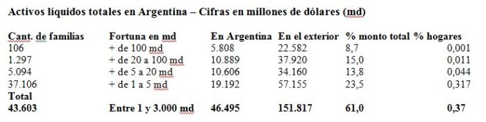Como lo leen: el 0,37% de las familias tiene el 61% de los “activos líquidos totales” del país. En realidad el porcentaje es aún mucho mayor, justamente porque no se consideran los activos no líquidos, como casas, terrenos, autos y yates; sólo la plata a la vista y disponible. Y de ese 61% del total, el 76,6% está en el exterior (obsérvese que cuanto más ricas son las familias, mayor es el porcentaje de activos fuera del país). Veamos ahora las cifras de la clase media alta y del resto de la sociedad: