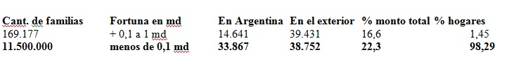 ¿Hace falta agregar comentarios? Recapitulemos: las 214.000 familias más ricas del país, ,el 1,8 del total, tienen el 77,6% de la riqueza líquida del país de 325.000 millones de dólares (tres cuartas partes fuera del país, claro), mientras que las otras 11 millones y medio de familias, más del 98%, tiene apenas el 22,4% de ese total, repartido casi mitad y mitad dentro y fuera del país (lo que se explica porque esa inmensa mayoría incluye desde la clase media no tan alta hasta los indigentes).