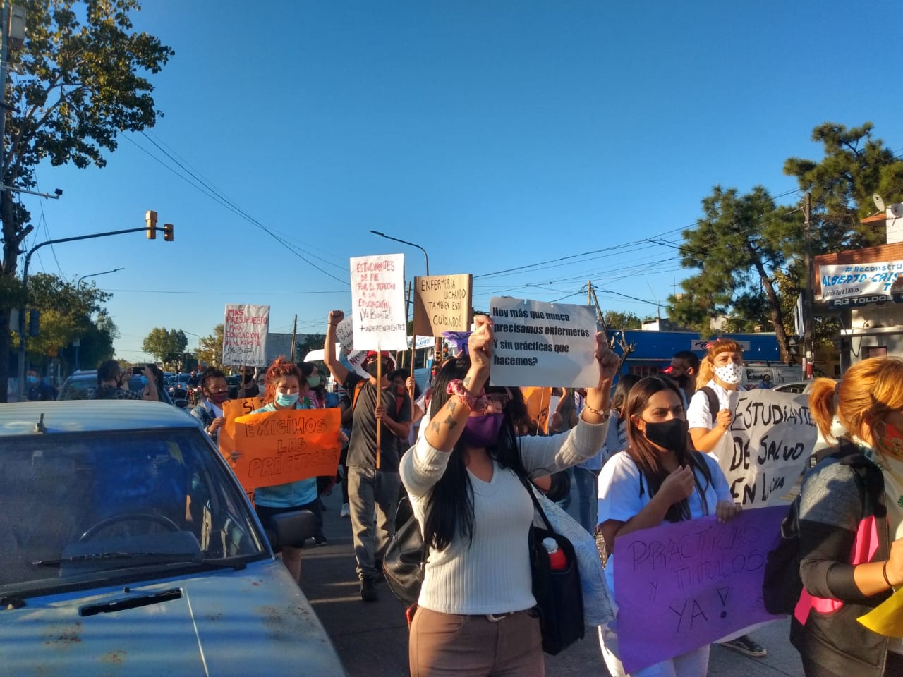 Principalmente se expresó el reclamo de las estudiantes de enfermería exigiendo que se habiliten las prácticas pre – profesionales que quedaron en suspenso con la virtualización de la educación y hoy les impiden avanzar con sus carreras.