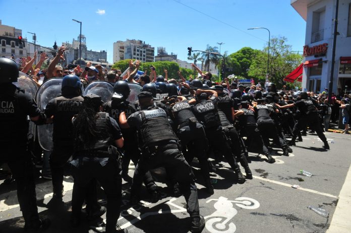 A las 13 horas, un cordón policial cortó la intersección de la 9 de julio y Avenida de Mayo dejando a miles de personas que hacían fila sin la posibilidad de seguir avanzando. Sin mediar conflicto alguno con los miles que se encuentran allí, aunque con una tensión creciente por la provocación represiva, la Policía comenzó a lanzar gases y avanzar de manera violenta sobre la gente.