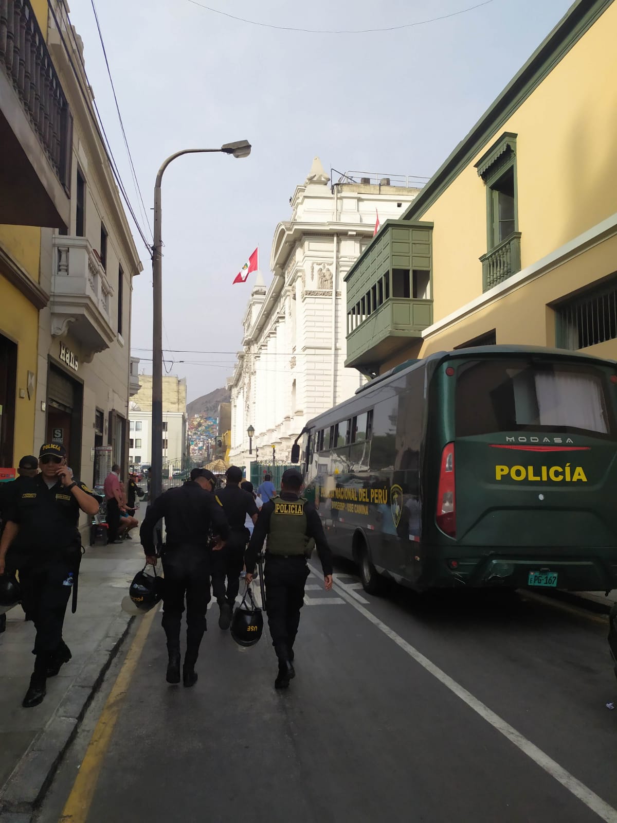 La policía no irrumpió contra la movilización esa tarde, ni la movilización fue al choque. Lima, obviamente es el centro del poder político no sólo por ser su capital y concentrar los edificios gubernamentales, sino además por ser tradicionalmente centro de la aristocracia y burguesía del país, que no reconoce al resto de Perú como peruanos[3]. Por esto, un choque abierto de fuerzas, en el marco de un país cuya zona sur permanece prácticamente paralizada al igual que algunos puntos del norte y centro del país, podría desatar una batalla con resultados inciertos, e incluso abrir paso a una eventual guerra civil, una situación que no parece ser inmediata pero que está en la cabeza tanto de la CGTP (que se alarmaban ante la posibilidad de un escenario de este tipo que consideraban posible) como de los activistas universitarios, tanto estudiantes como docentes con los que conversamos al día siguiente, que nos señalaban que una represión sangrienta en la capital podría dar lugar a una guerra civil por que la gente no lo iba a tolerar.